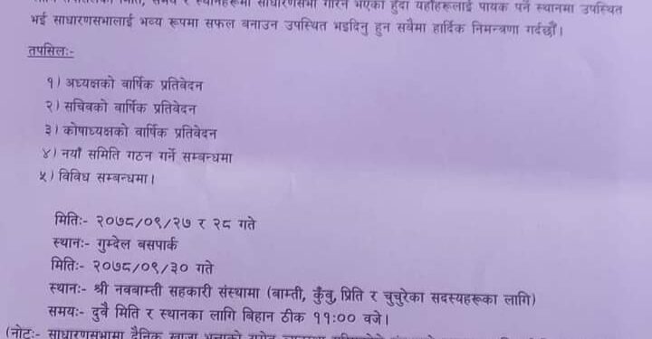 श्री नवबाम्ती भण्डार सहकारी संस्था लि. काे २१ औं बार्षिक साधारणसभा; उपस्थितिको लागि सबैलाई अपिल